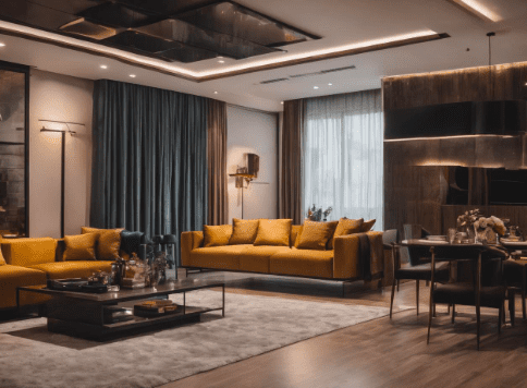 With the sofa and furniture installed, you may think your all set but a good carpet or rug can make for an excellent finishing touch to any room. There are many different materials and sizes available that will suit various needs: For places with softer walls in need of some warmth, consider getting one made out faux fur material. If instead of warm colours what is desired is more neutral tones then there’s no better choice than something made from lighter fabric like silk velvet; if darker hues dominate most areas get a dark coloured carpet as well! The size chosen should also be appropriate considering the home’s floor space so it doesn’t overwhelm it ; this way people won’t even notice where carpets end since they match up perfectly at the corners. As a finishing touch, add some accent pieces of furniture to the room for an extra flair and elegance.6. Platforms & Elevations